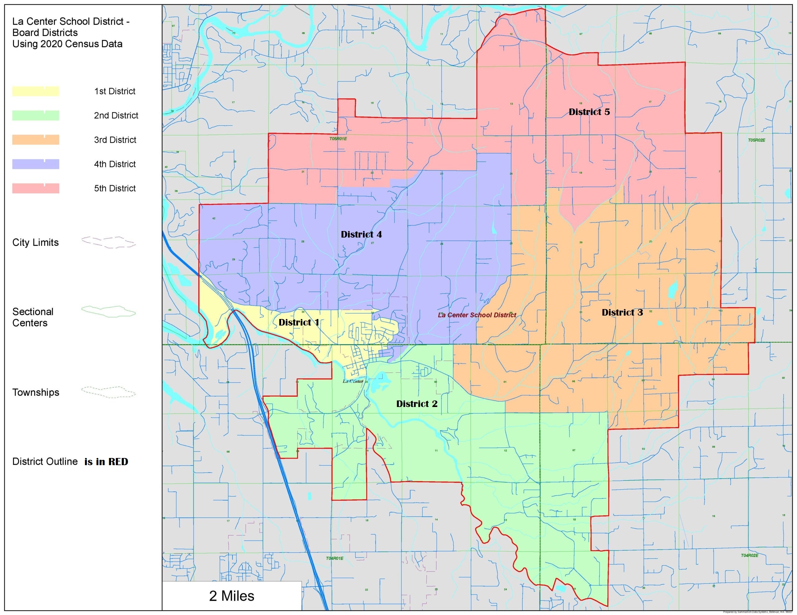 The La Center School District is divided into five board of director areas, each representing a specific geographic region within the district. The map illustrates the boundaries of these areas.